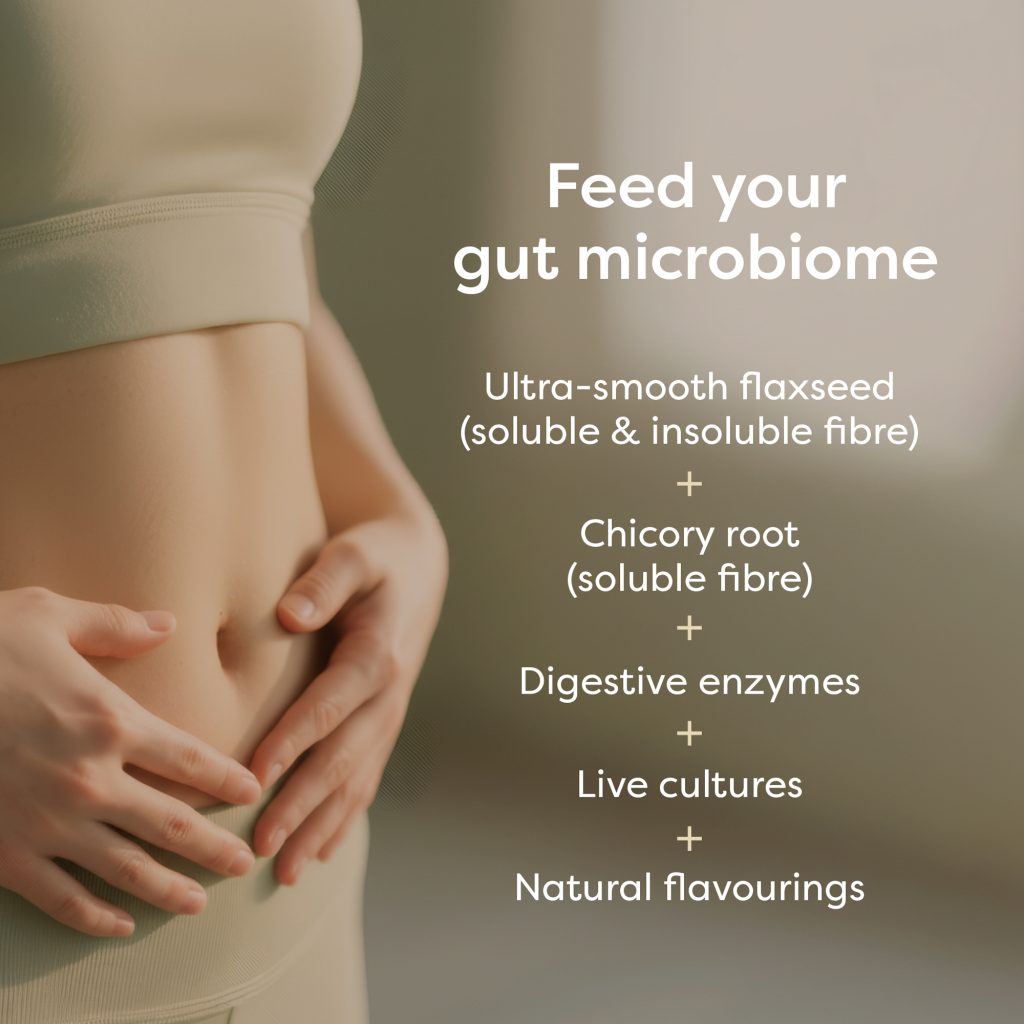 Chicory Inulin (Fructo Oligo Saccharide) (72.5%), Ultra Smooth Flax Seed (11.1%), Citric Acid, Flavouring, Amylas* (Starch Hydrolyzing Enzyme) (0.33%), Cellulase (Cellulose Hydrolyzing Enzyme) (0.33%), Lactase (Lactose Hydrolyzing Enzyme) (0.33%), Lipase (Fat Hydrolyzing Enzyme) (0.33%) Neutral Protease (Protein Hydrolyzing Enzyme) (0.33%), Bacillus Coagulans (live cultures) (1.11%), Orange Juice Powder, Stevia (Sweetener)