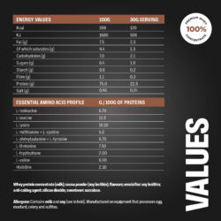 Our high impact Chocolate Flavoured Whey includes 5.5g of BCAAs, 22.5g protein and all 9 essential amino acids that naturally occur in protein and contribute to building and repairing new muscle. With just 2.3g of fat, 2.1g of carbs, and at just 120 calories per serving, our high impact chocolate flavour whey protein will fit your routine, whatever your fitness goals.