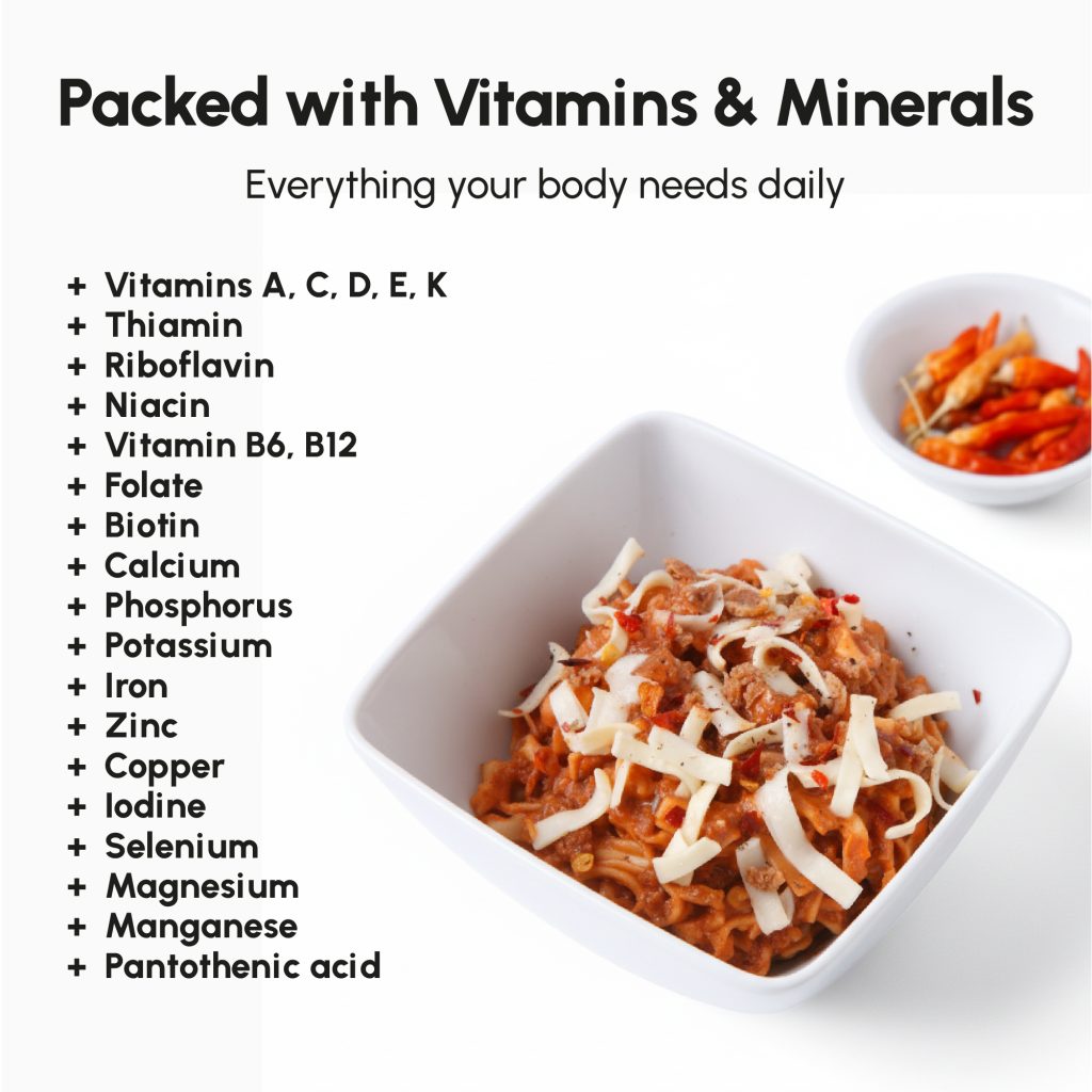 Vegetable protein blend (soy protein textured (malt extract), vegetable protein); egg noodles (durum wheat flour (gluten), egg yolk, niacin, ferrous sulfate, thiamine mononitrate, riboflavin, folic acid); dehydrated vegetable (dehydrated onion, tomato powder, red bell pepper, sweet corn piece) ; vegetable oil preparation (sunflower oil and refined soybean oil, maltodextrin, milk protein, emulsifier: soy lecithin E322, antioxidants: ascorbyl palmitate E304, alpha tocopherol E307); chilli powder seasoning (chilli, cumin, garlic, pepper, oregano, salt, colour: caramel E150c, dextrose, aromatic caramel); acidity regulators: potassium chloride E508, potassium citrate E332, magnesium oxide E530; flavours; thickener: modified starch E1422; maltodextrin; vitamin and mineral mix (dicalcium phosphate, L-ascorbic acid (vit. C), nicotinamide (vit. B3), ferric pyrophosphate, zinc oxide, D-alpha-tocopheryl acetate (vit. E), D-pantothenate calcium (vit. B5), sodium fluoride, manganese sulfate, pyridoxine hydrochloride (vit. B6), riboflavin (vit. B2), copper gluconate, thiamin hydrochloride (vit. B1), retinyl acetate (vit. A), pteroylmonoglutamic acid (vit. B9), potassium iodide, phylloquinone (vit. K1), sodium selenite, D-biotin (vit. B8), chromium chloride, ergocalciferol (vit. D2), cyanocobalamin (vit. B12)); colour: beetroot red E162; salt; stabilizer: calcium phosphates E341; antioxidant: tocopherol-rich extract E306; sweetener: sucralose E955.