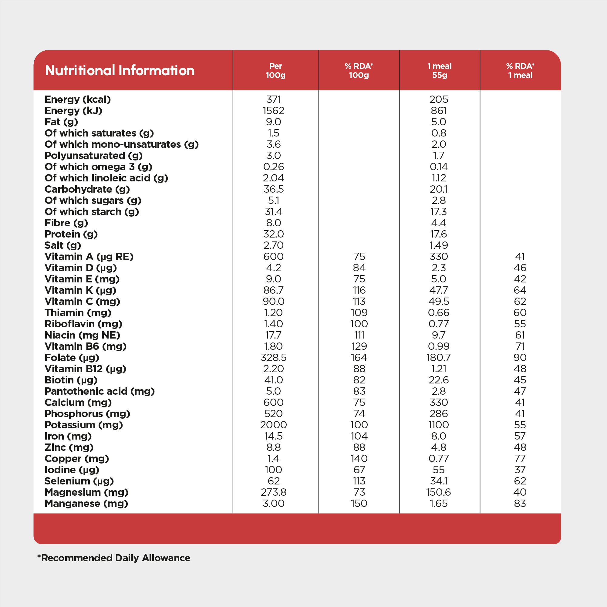 | Per 100g | RDA % (Per 100g) | Per Serving (55g) | RDA % (Per Serving) | |