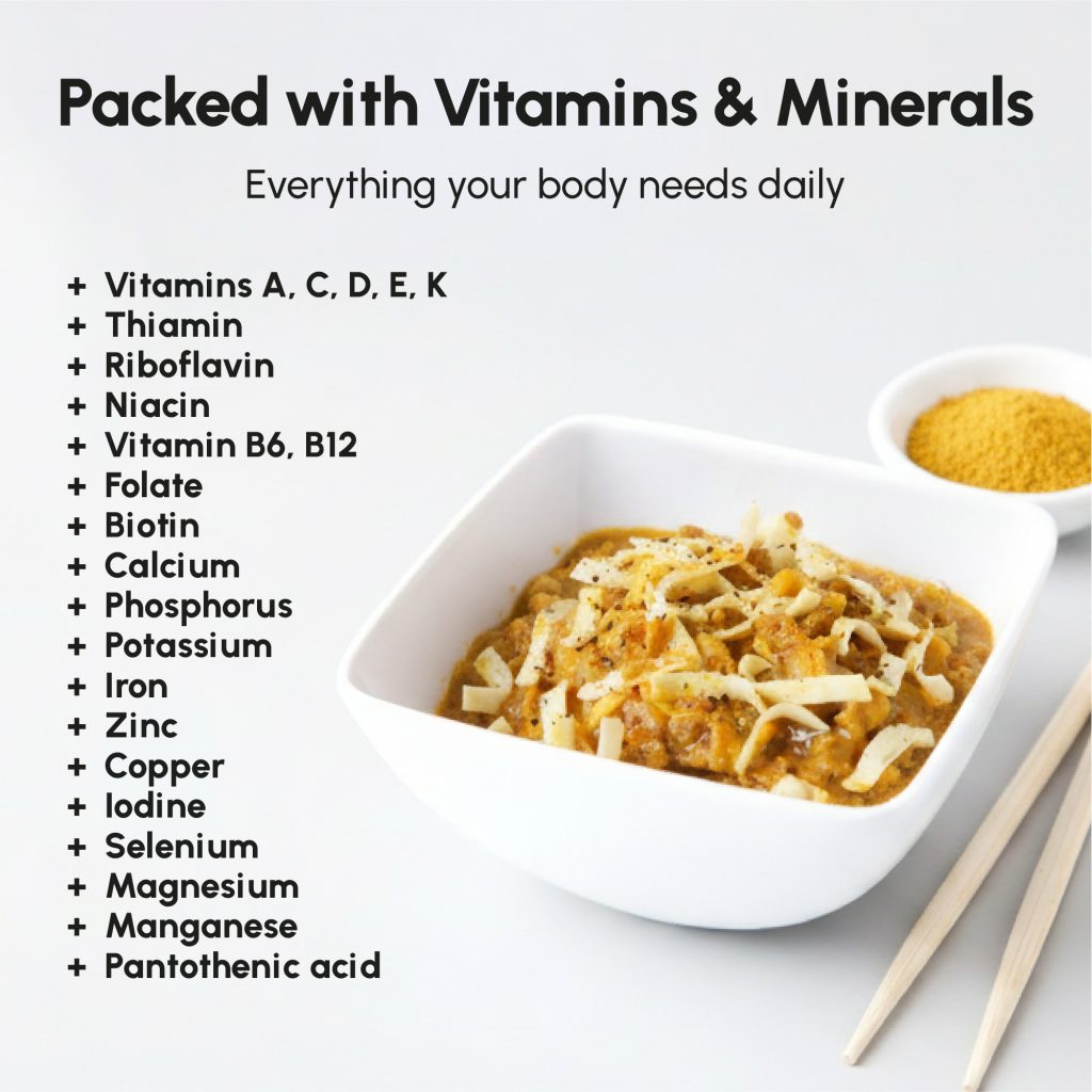 Protein blend (textured soy protein (malt extract), vegetable protein); egg noodles (wheat flour (gluten), egg, niacin, ferrous sulfate (iron), thiamin mononitrate, riboflavin and folic acid); vegetable oils preparation (refined soybean oil and sunflower oil, maltodextrin, milk protein, emulsifier: soy lecithin E322, antioxidants: ascorbyle palmitate E304, alpha tocopherol E307); curry herbs and spices mix (4.4%) (turmeric, cumin, coriander, cayenne pepper, garlic, fenugreek, caraway, pepper, cloves, celery, salt); acidity regulators: potassium chloride E508, potassium citrate E332, magnesium oxide E530; dehydrated onion; thickener modified starch E1422; maltodextrin; vitamin and mineral mix (dicalcium phosphate, L-ascorbic acid (vit. C), nicotinamide (vit. B3), ferric pyrophosphate, zinc oxide, D-alpha-tocopheryl acetate (vit. E), D-pantothenate calcium (vit. B5), sodium fluoride, manganese sulfate, pyridoxine hydrochloride (vit. B6), riboflavin (vit. B2), copper gluconate, thiamin hydrochloride (vit. B1), retinyl acetate (vit. A), pteroylmonoglutamic acid (vit. B9), potassium iodide, phylloquinone (vit. K1), sodium selenite, D-biotin (vit. B8), chromium chloride, ergocalciferol (vit. D2), cyanocobalamin (vit. B12)); carrots dice; flavours (soy, celery) (contains enhancers flavors E621, E627 & E631) salt; stabilizer calcium phosphates E341; parsley; antioxidant: tocopherol-rich extract E306.
