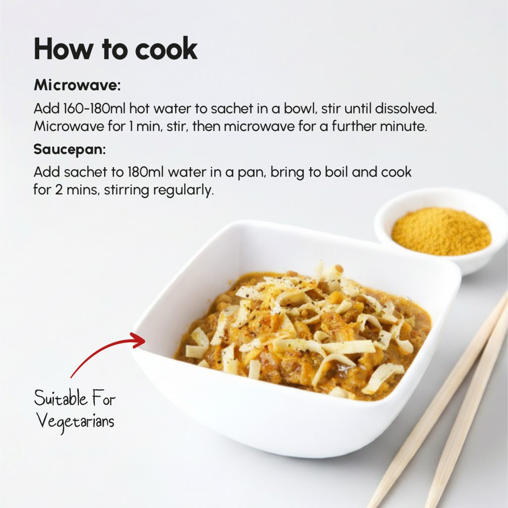 Our delicious noodles are ideal as a quick lunch or dinner, and are full of all the healthy stuff you need when losing weight as part of a very low calorie diet. You’ll be amazed that our Chicken Curry Noodles are just 201 Kcal while still being packed full of protein, fibre and various other vitamins and minerals. They’re even suitable for Vegetarians!