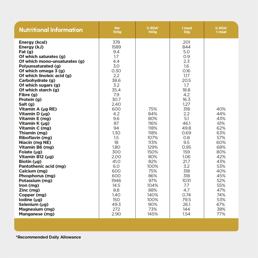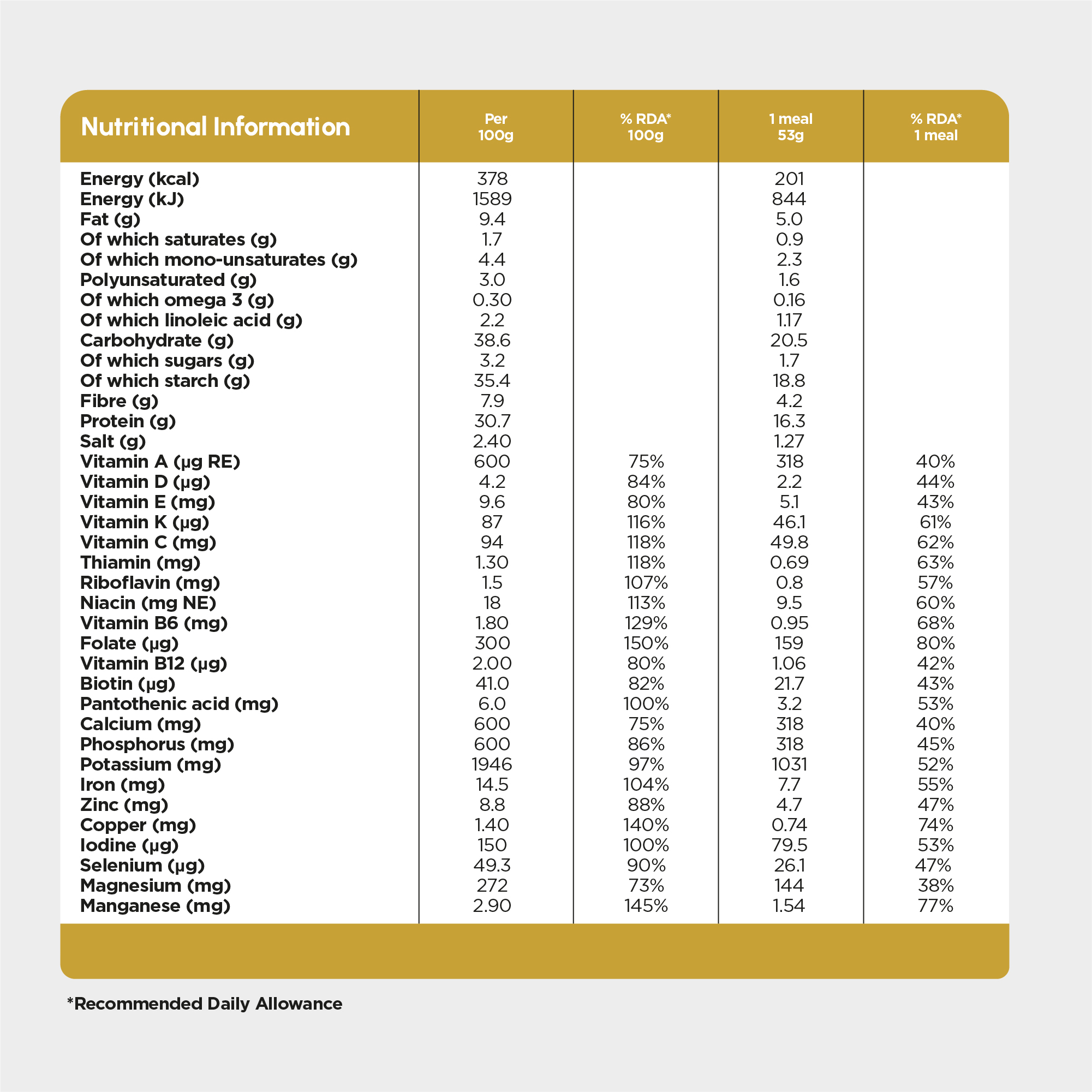 | Per 100g | RDA % (Per 100g) | Per Serving (53g) | RDA % (Per Serving) | |