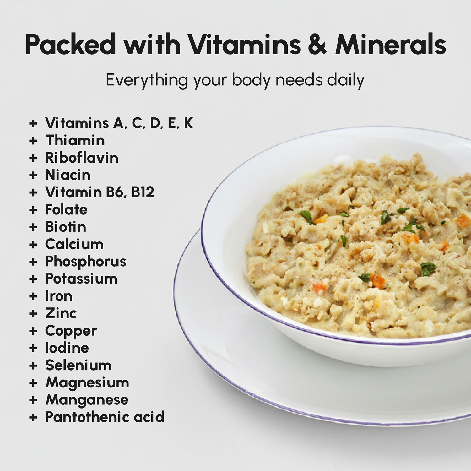 Textured soy protein (colour: malt); potato flakes (27.7%); dehydrated vegetables (9.4%) (onions, potato powder, carrots, organic garlic); vegetable fat preparation (sunflower and soybean oils; maltodextrin; milk protein; emulsifier: soy lecithin; antioxidants: ascorbyle palmitate, alpha tocopherols); flavours (celery); hydrolyzed vegetable protein; acidity regulators: tricalcium phosphate, magnesium oxide, potassium chloride; vitamin and mineral mix (L-ascorbic acid (vit. C), nicotinamide (vit. B3), alpha-tocopherol acetate (vit. E), zinc oxide, ferric pyrophosphate, calcium D-pantothenate (vit. B5), manganese sulfate, pyridoxine chlorhydrate (vit. B6), riboflavin (vit. B2), thiamin chlorhydrate (vit. B1), copper gluconate, retinol acetate (vit. A), pteroylmonoglutamic acid (vit. B9), potassium iodide, phylloquinone (vit. K1), sodium selenite, D-biotin (vit. B8), ergocalciferol (vit. D2), cyanocobalamin (vit. B12)); spices; vegetable protein; salt; thickener: guar gum; yeast extract; parsley; stabilizer: magnesium phosphate; antioxidants: tocopherol; colour: turmeric extract.