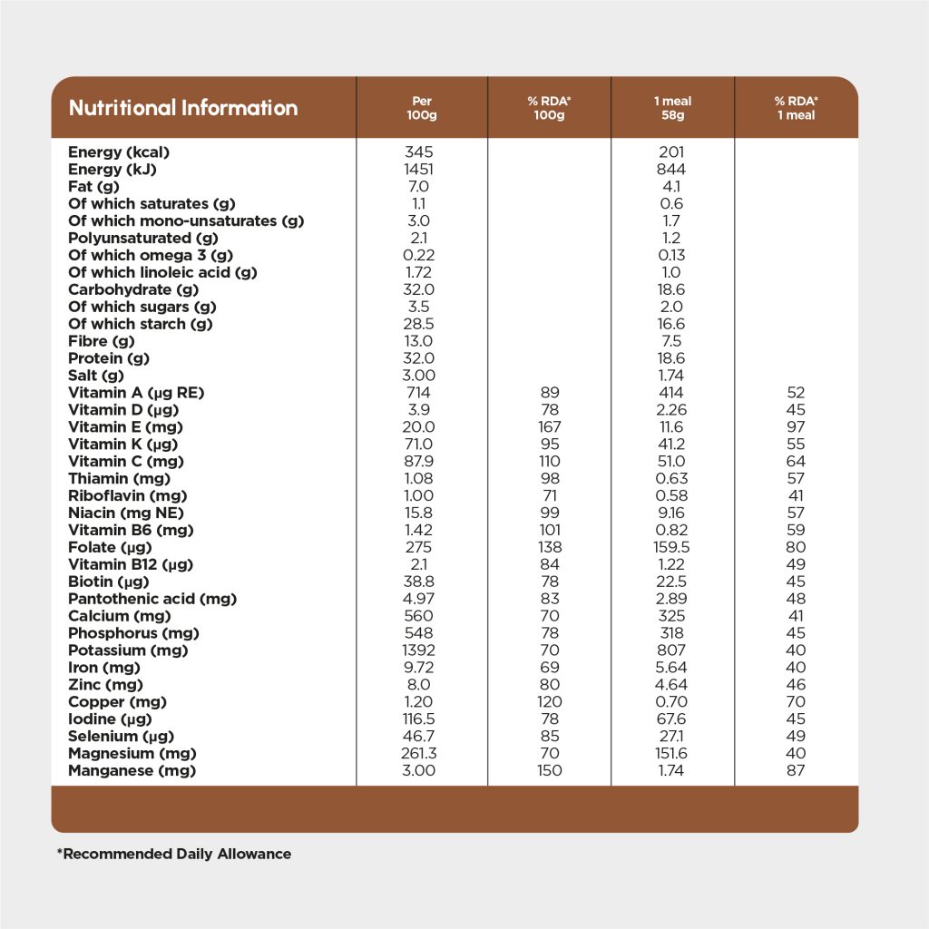 | Per 100g | RDA % (Per 100g) | Per Serving (58g) | RDA % (Per Serving) | |