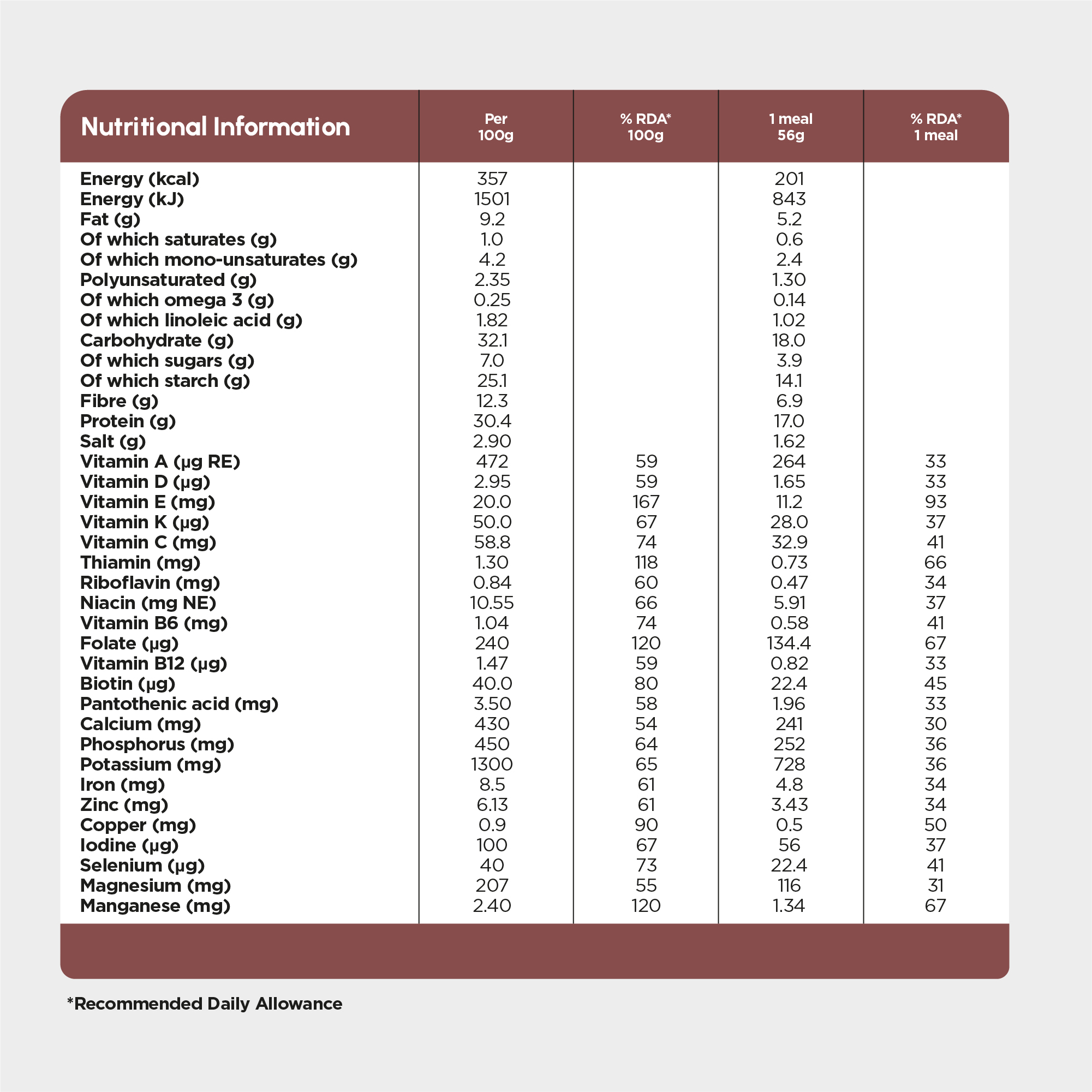 | Per 100g | RDA % (Per 100g) | Per Serving (56g) | RDA % (Per Serving) | |