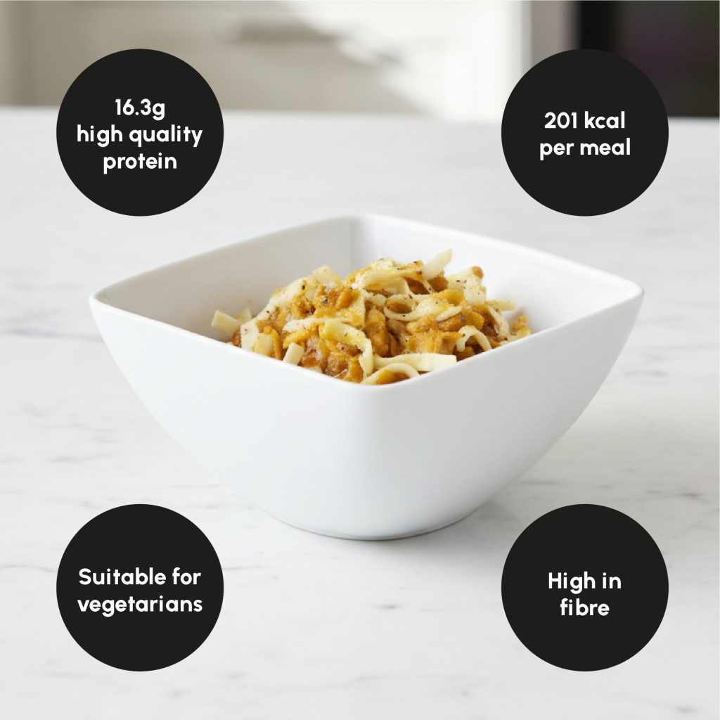 Protein blend (textured soy protein (malt extract), vegetable protein); egg noodles (wheat flour (gluten), egg, niacin, ferrous sulfate (iron), thiamin mononitrate, riboflavin and folic acid); vegetable oils preparation (refined soybean oil and sunflower oil, maltodextrin, milk protein, emulsifier: soy lecithin E322, antioxidants: ascorbyle palmitate E304, alpha tocopherol E307); curry herbs and spices mix (4.4%) (turmeric, cumin, coriander, cayenne pepper, garlic, fenugreek, caraway, pepper, cloves, celery, salt); acidity regulators: potassium chloride E508, potassium citrate E332, magnesium oxide E530; dehydrated onion; thickener modified starch E1422; maltodextrin; vitamin and mineral mix (dicalcium phosphate, L-ascorbic acid (vit. C), nicotinamide (vit. B3), ferric pyrophosphate, zinc oxide, D-alpha-tocopheryl acetate (vit. E), D-pantothenate calcium (vit. B5), sodium fluoride, manganese sulfate, pyridoxine hydrochloride (vit. B6), riboflavin (vit. B2), copper gluconate, thiamin hydrochloride (vit. B1), retinyl acetate (vit. A), pteroylmonoglutamic acid (vit. B9), potassium iodide, phylloquinone (vit. K1), sodium selenite, D-biotin (vit. B8), chromium chloride, ergocalciferol (vit. D2), cyanocobalamin (vit. B12)); carrots dice; flavours (soy, celery) (contains enhancers flavors E621, E627 & E631) salt; stabilizer calcium phosphates E341; parsley; antioxidant: tocopherol-rich extract E306.