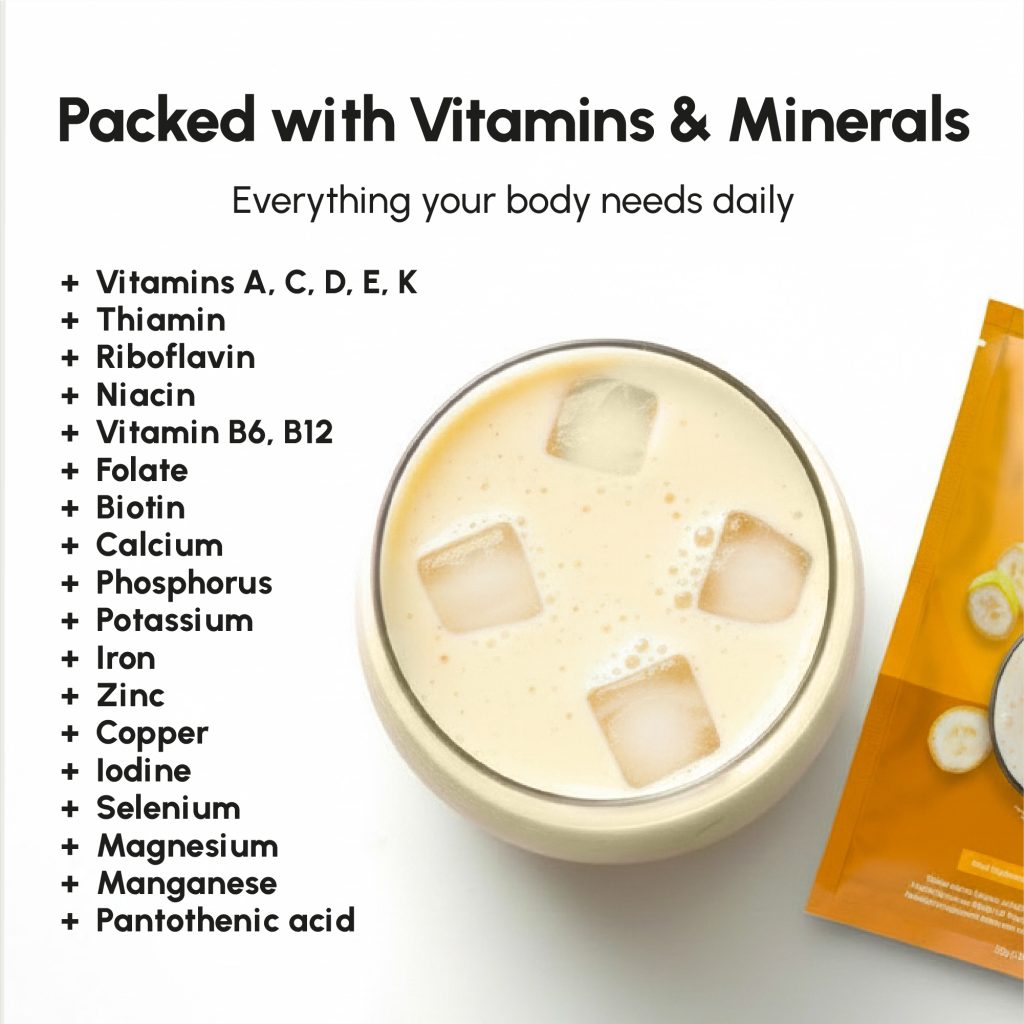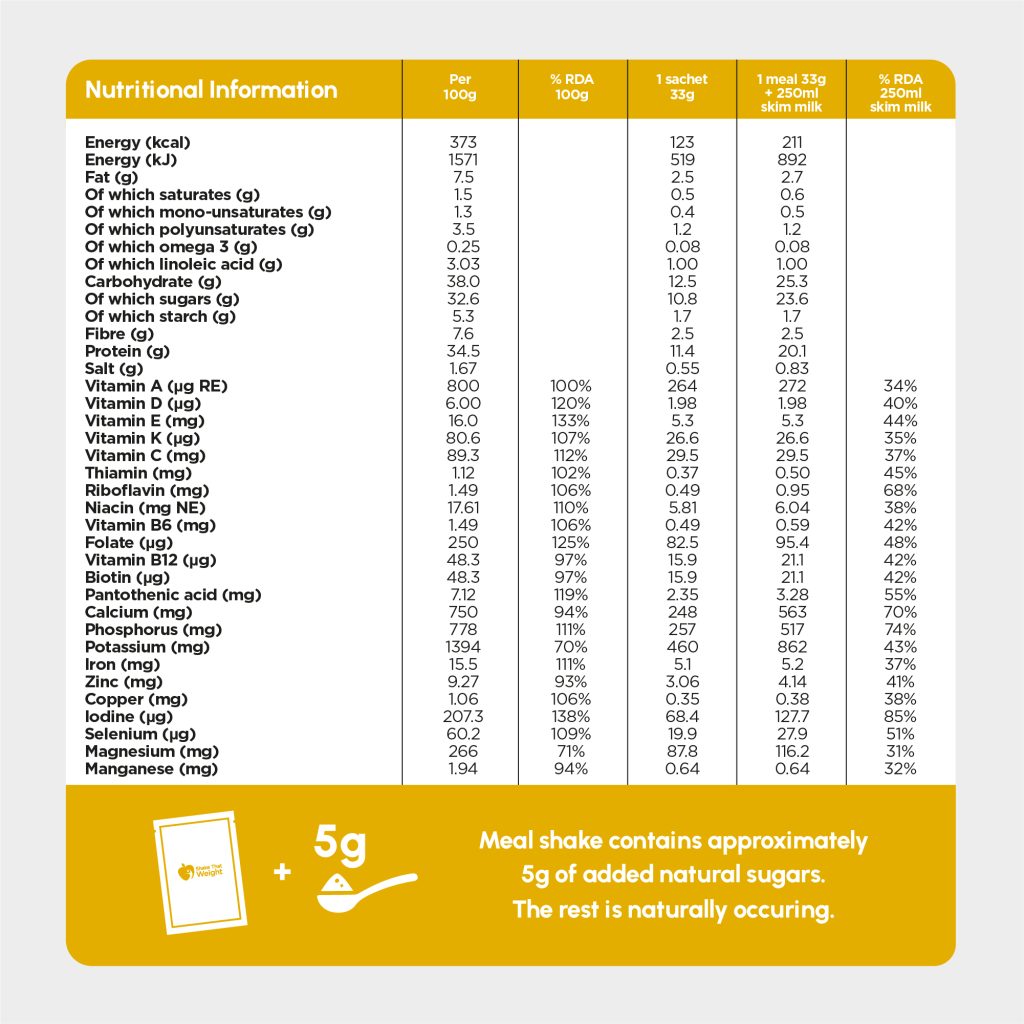 | Per 100g | RDA % (Per 100g) | Per Serving (33g) | RDA % (Per Serving) | Per Serving + 250ml skim milk | % RDA 1 sachet + 250ml skim milk | |