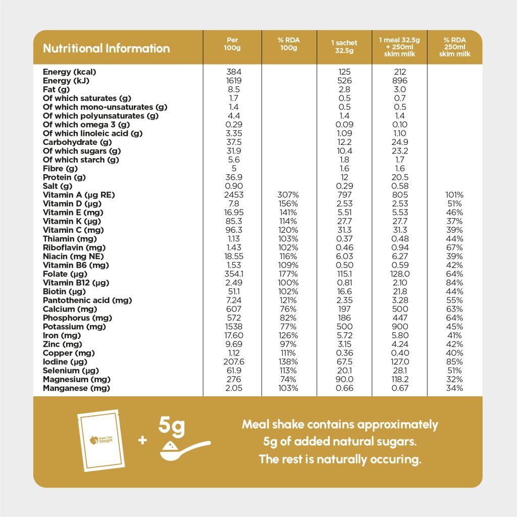 Each meal shake has approximately 5g of free (added) natural sugars which is the equivalent of a teaspoon. This means that if you used 4 of our shakes a day for a total food replacement diet you would consume 20g of free sugars daily, which is within the NHS guidelines of 30g of sugar daily for an adult.