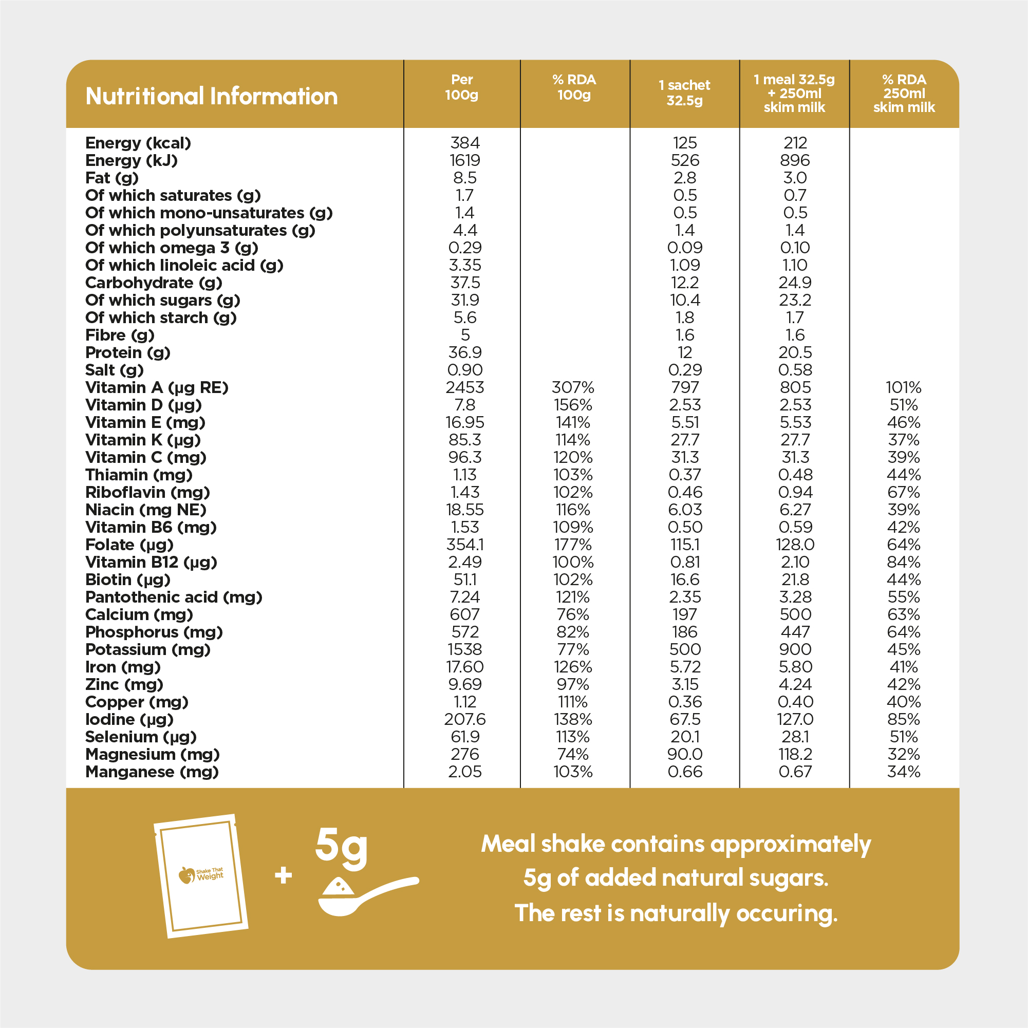 | Per 100g | RDA % (Per 100g) | Per Serving (32.5g) | RDA % (Per Serving) | Per Serving + 250ml skim milk | % RDA 1 sachet + 250ml skim milk | |