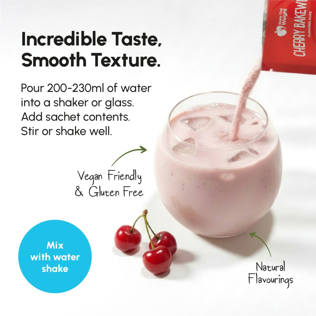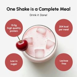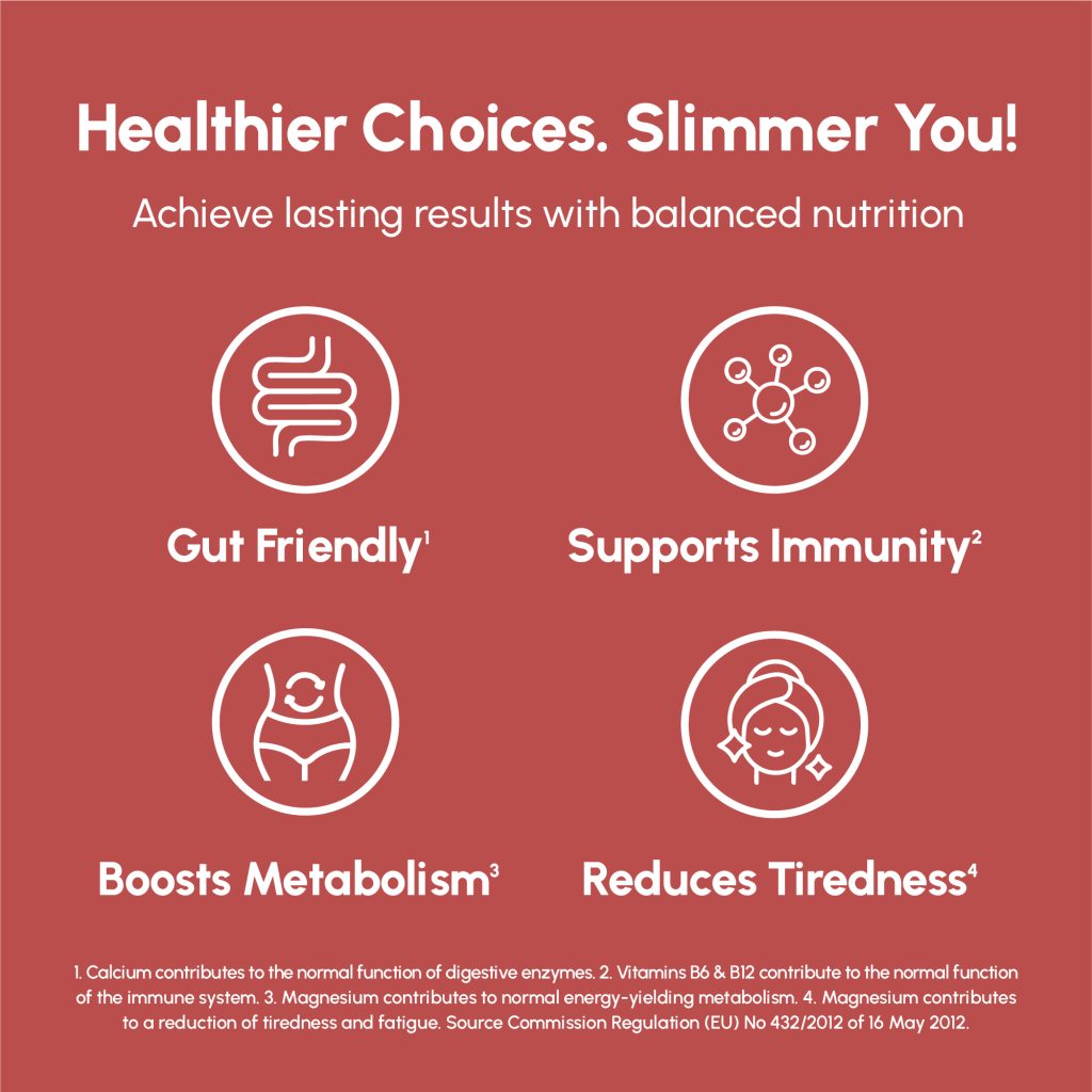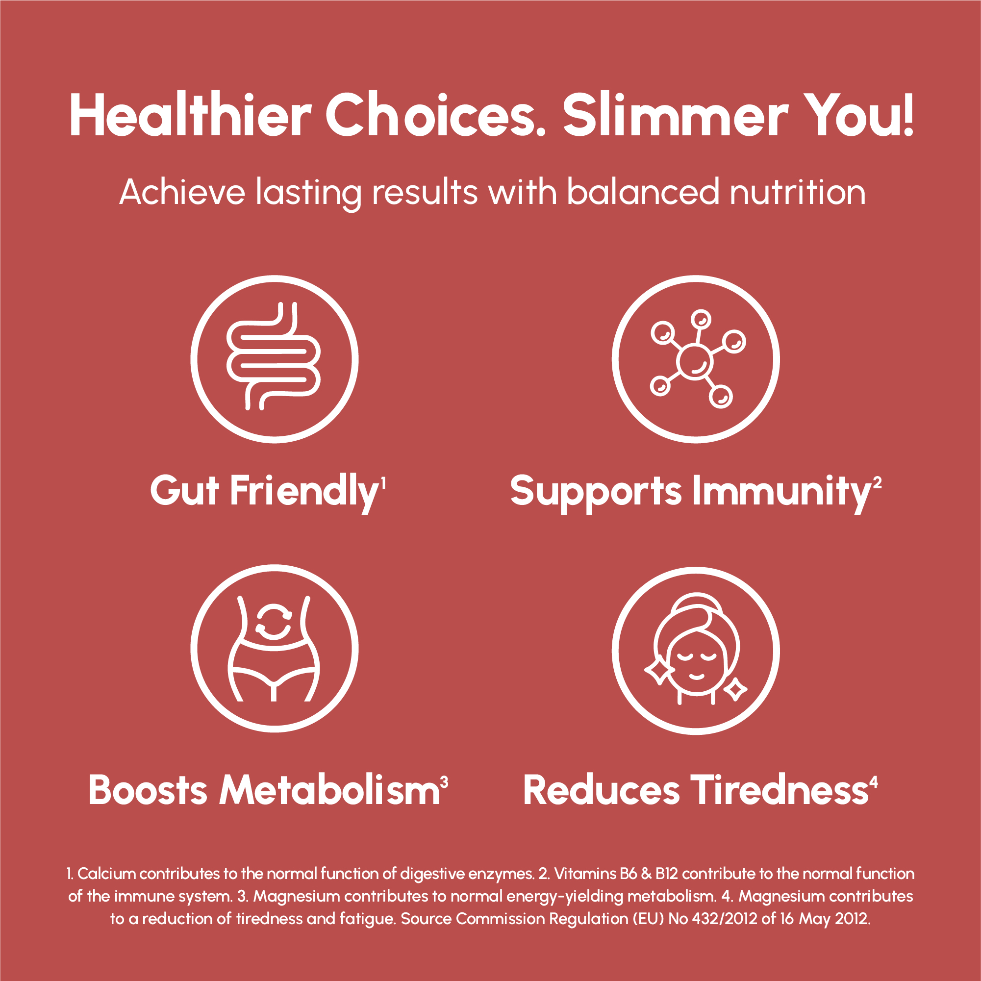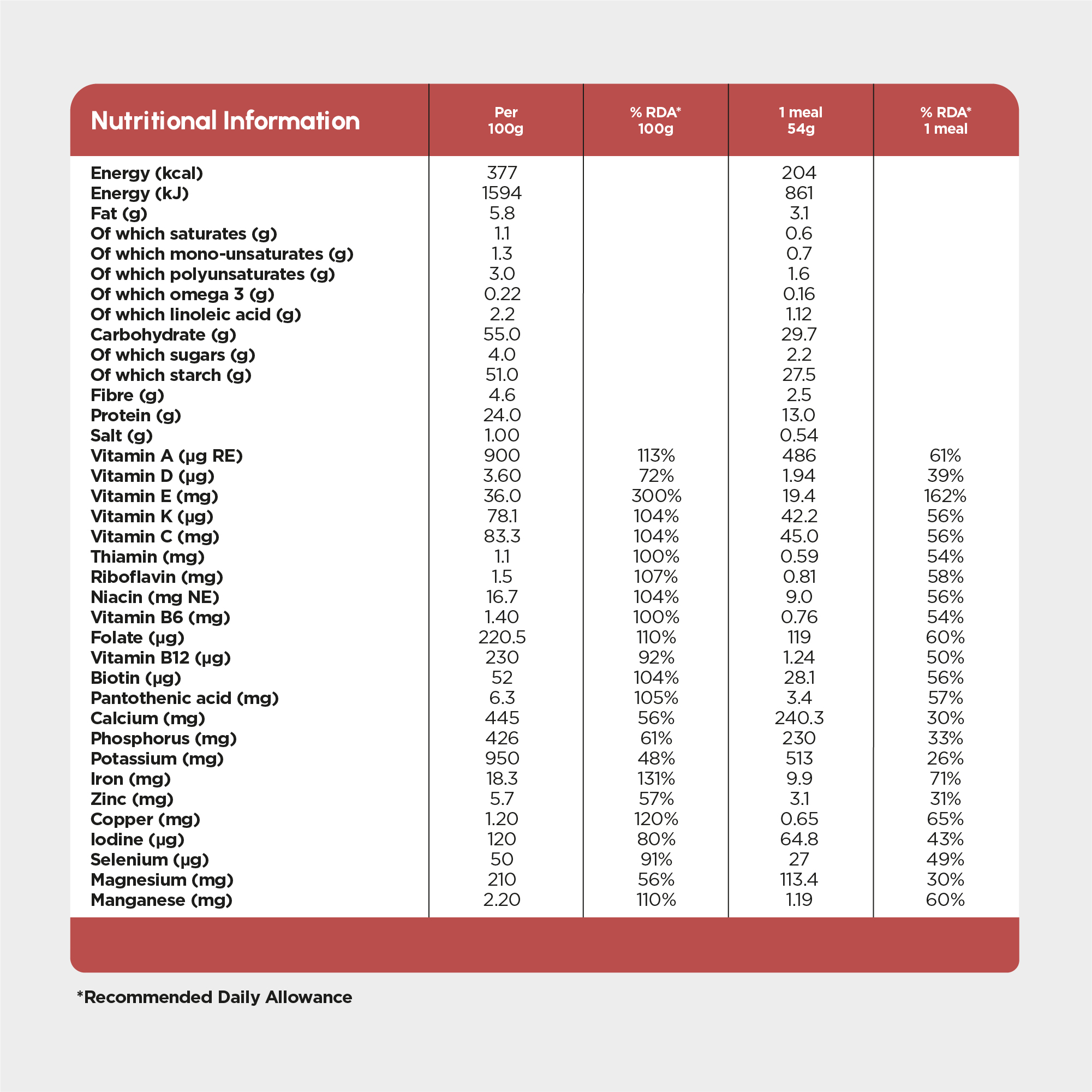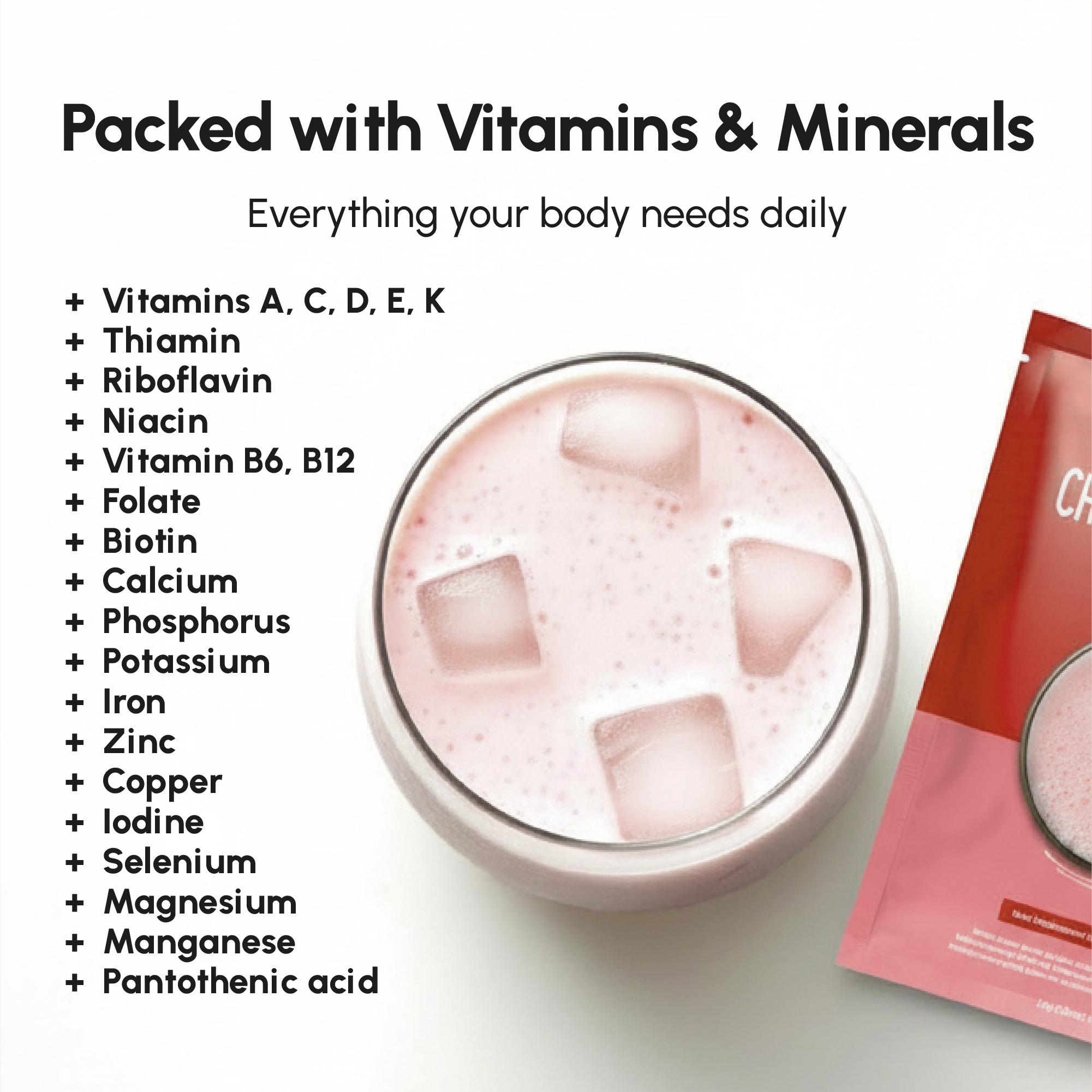 Maltodextrin; vegetable protein (soy); vitamin and mineral mix (potassium, magnesium, calcium, iron, phosphorus, zinc, sodium, fluoride, manganese, cooper, iodine, selenium, molybdenum, chromium, vit A, vit B1, vit B2, vit B3, vit B5, vit B6, vit B8, vit B9, vit B12, vit C, vit D3, vit E, vit K); refined soybean oil; polydextrose E1200; natural flavours; stabilisers: calcium phosphates E341, magnesium phosphates E343; thickeners: guar gum E412, xanthan gum E415; colour: beetroot red E162; salt; antioxidant: tocopherol-rich extract E306; sweetener: sucralose E955.