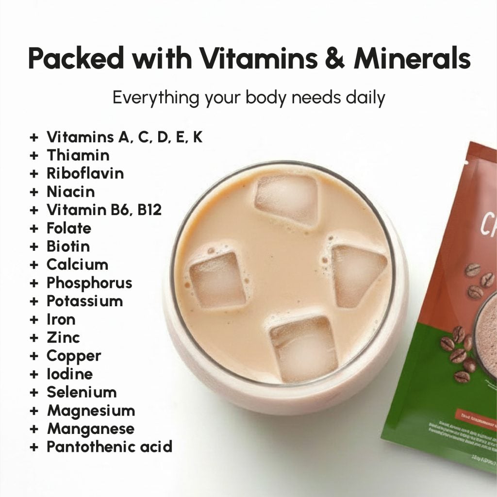 Maltodextrin ; vegetable protein (soy) ; polydextrose E1200 ; fat reduced cocoa powder (6,6%) ; refined soybean oil ; vitamin and mineral mix (potassium, magnesium, calcium, iron, phosphorus, zinc, sodium, fluoride, manganese, cooper, iodine, selenium, molybdenum, chromium, vit A, vit B1, vit B2, vit B3, vit B5, vit B6, vit B8, vit B9, vit B12, vit C, vit D3, vit E, vit K) ; stabilisers : calcium phosphates E341, magnesium phosphates E343 ; thickeners : guar gum E412, xanthan gum E415 ; flavor ; salt ; antioxidant : tocopherol rich-extract E306 ; sweetener : sucralose E955.