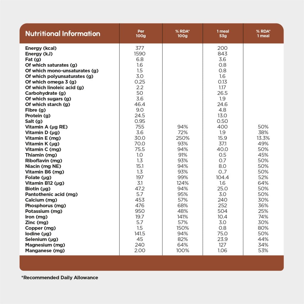 | Per 100g | RDA % (Per 100g) | Per Serving (53g) | RDA % (Per Serving) | |