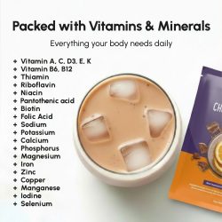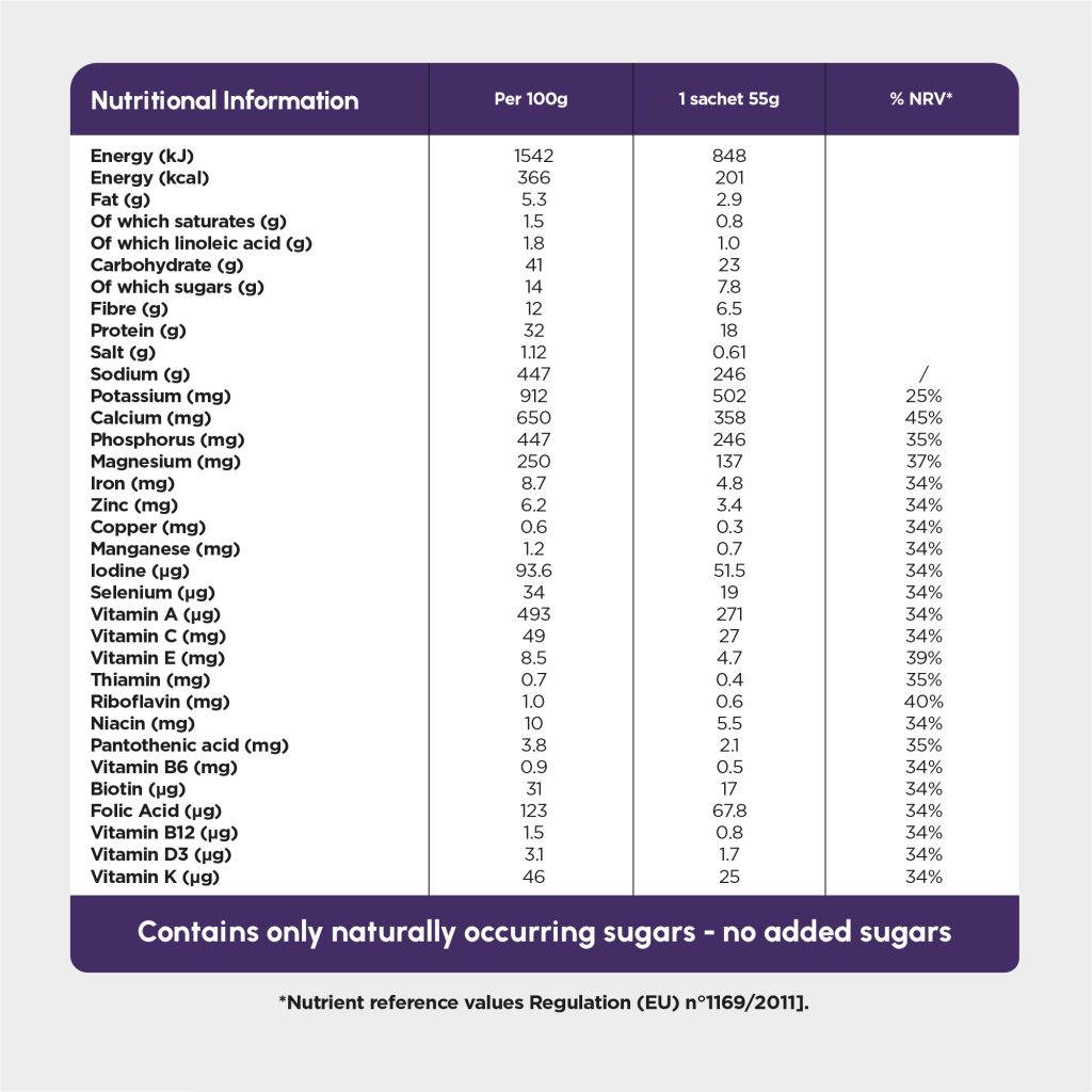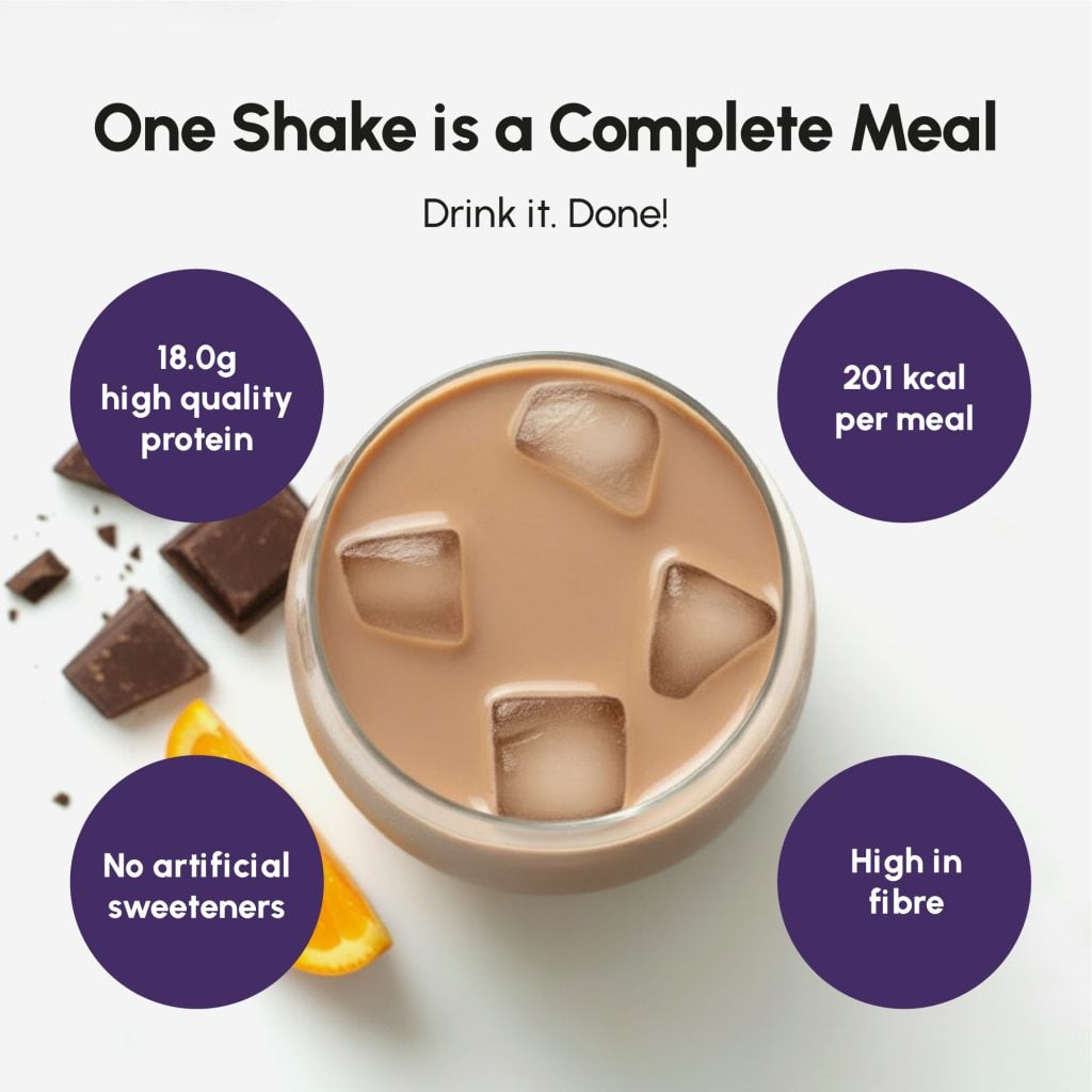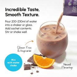 Milk proteins (emulsifier: lecithins), maltodextrin, powdered skimmed milk, chicory inulin, fat-reduced cocoa powder (8%), soy oil, concentrated orange juice powder (2.5%), minerals (magnesium carbonate, potassium carbonate, ferrous fumarate, zinc oxide, potassium iodide, sodium selenite, manganese sulphate, cupric sulphate), salt, thickeners: xanthan gum and guar gum, vitamins (C, E, B9, B3, A, B5, B8, B12, D3, B6, K, B1, B2,), natural flavouring, sweetener: steviol glycosides from Stevia, emulsifier: soy lecithin, lactase, antioxidants: fatty acid esters of ascorbic acid and alpha-tocopherol. May contain traces of: gluten, egg, fish, nuts, celery. No added gluten.