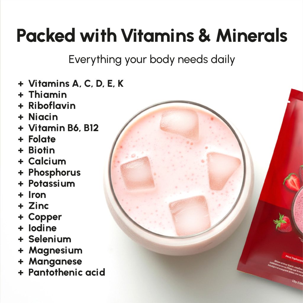 Protein blend (milk protein (emulsifier : lecithins E322 (soy)), vegetable protein) ; skim milk powder ; fructose ; vegetable oil preparation (refined soybean oil, milk protein, stabiliser : triphosphates E451, natural flavour) ; polydextrose E1200 ; flavours (milk) ; vitamin and mineral mix (sodium, potassium, magnesium, iron, zinc, manganese, copper, iodine, selenium, vit A, vit B1, vit B2, vit B3, vit B5, vit B6, vit B8, vit B9, vit B12, vit C, vit D, vit E, vit K) ; dehydrated strawberry (1.8%) ; thickeners : guar gum E412, carrageenan E407, starch ; stabiliser : magnesium phosphates E343 ; colours : beetroot red E162, curcumin E100.