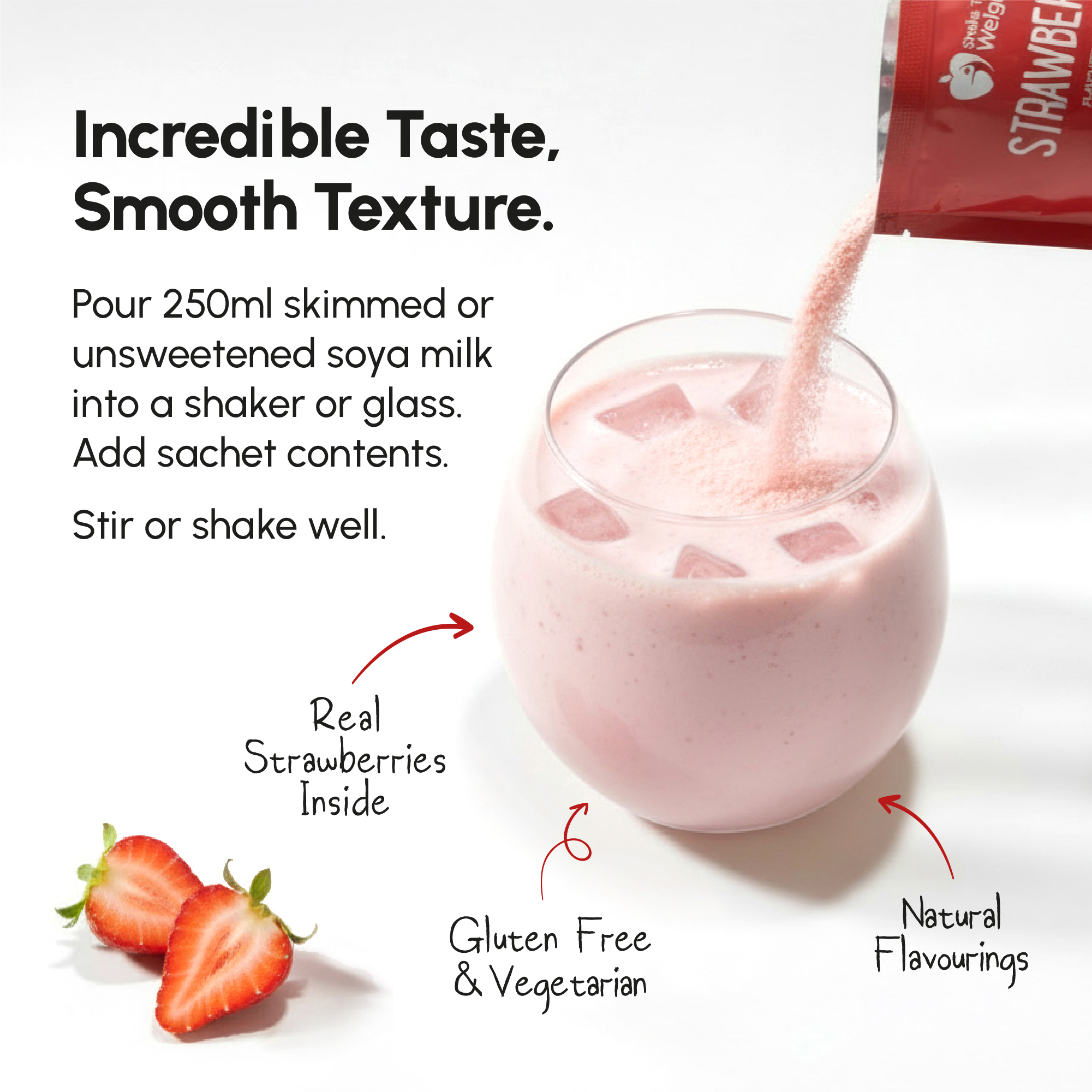 Our delicious and creamy Strawberry Shakes are a great choice as a meal replacement if you’re on one of our diet plans. Our shakes are best when mixed with skimmed milk or unsweetened soya milk – If you wish, you can mix them with water for a fortified meal of 125 calories.