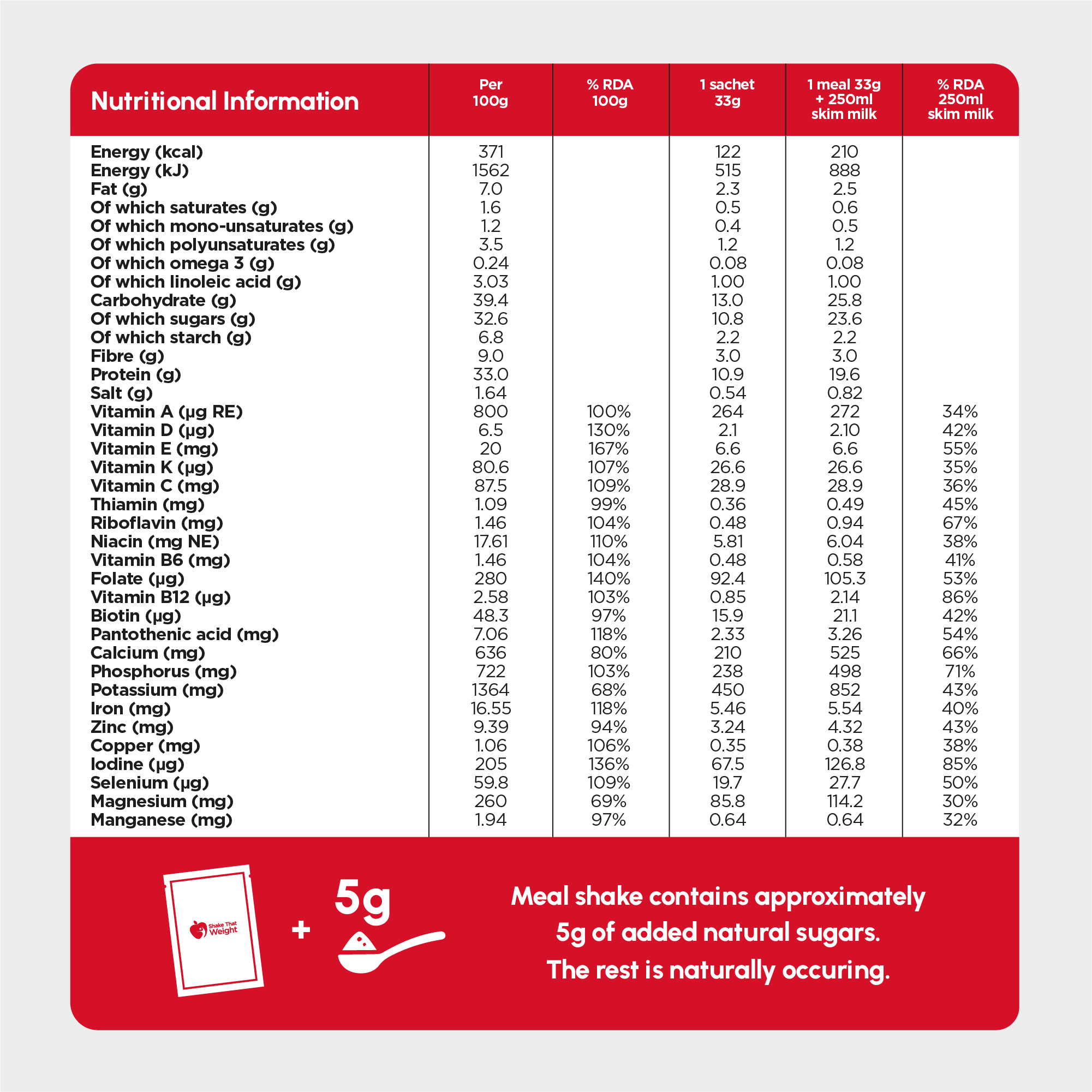 | Per 100g | RDA % (Per 100g) | Per Serving (33g) | RDA % (Per Serving) | Per Serving + 250ml skim milk | % RDA 1 sachet + 250ml skim milk | |