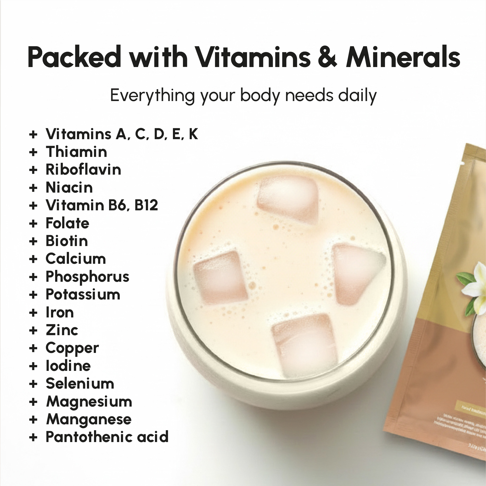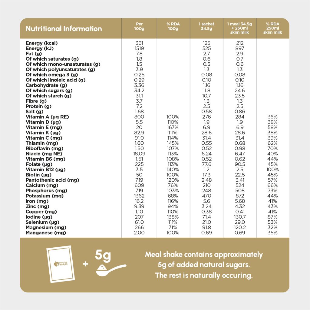 | Per 100g | RDA % (Per 100g) | Per Serving (34.5g) | RDA % (Per Serving) | Per Serving + 250ml skim milk | % RDA 1 sachet + 250ml skim milk | |