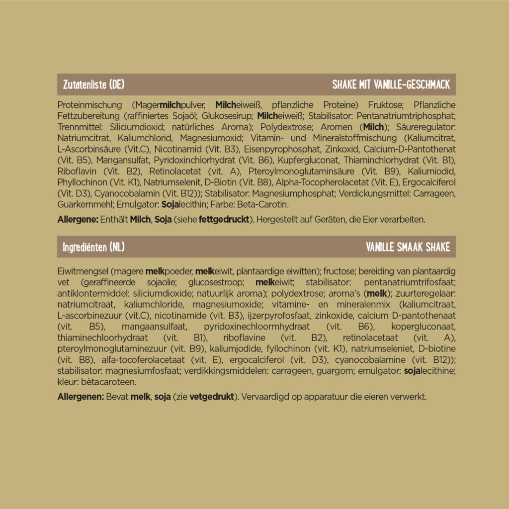 Protein blend (milk protein (emulsifier : lecithins E322 (soy)), vegetables protein) ; skim milk powder ; fructose ; vegetable oil preparation (refined soybean oil, milk protein, stabiliser : triphosphates E451, natural flavour) ; polydextrose E1200 ; flavours (milk) (contains caramel color E150d) ; vitamin and mineral mix (sodium, potassium, magnesium, iron, zinc, manganese, copper, iodine, selenium, vit A, vit B1, vit B2, vit B3, vit B5, vit B6, vit B8, vit B9, vit B12, vit C, vit D, vit E, vit K) ; thickeners : carrageenan E407, guar gum E412 ; stabiliser : magnesium phosphates E343 ; color : beta carotene E160a.