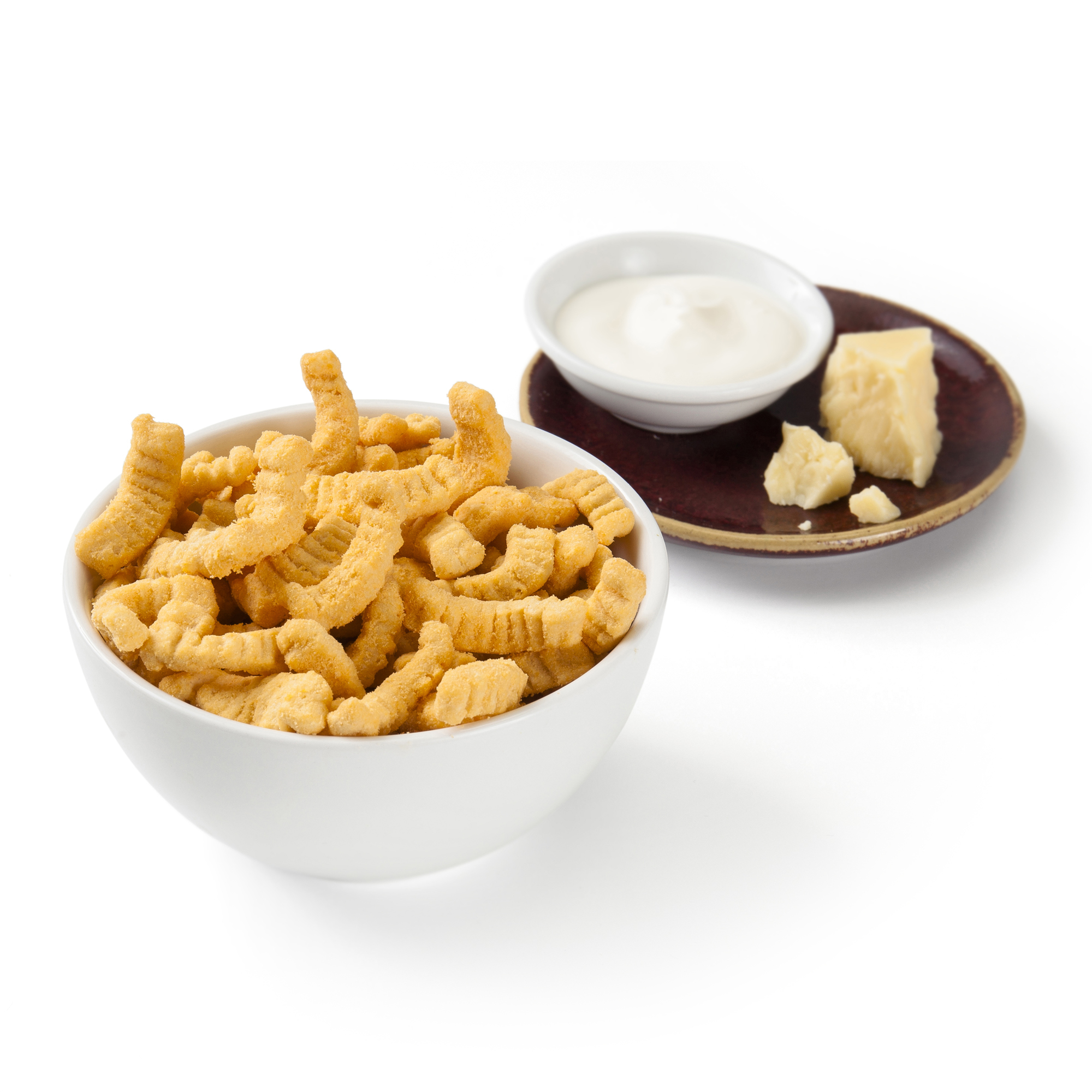 Soy protein and flour ; potato powder & starch ; cheese seasoning (natural flavours (milk), cheeses powder (milk) (5.8%) (of which Cheddar), salt, colour : paprika extract E160c) ; vegetable oils in varying proportions (sunflower, rapeseed) ; acids : lactic acid E270, calcium lactate E327 ; salt.